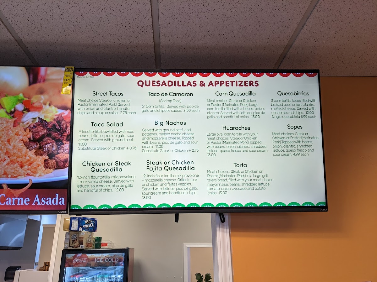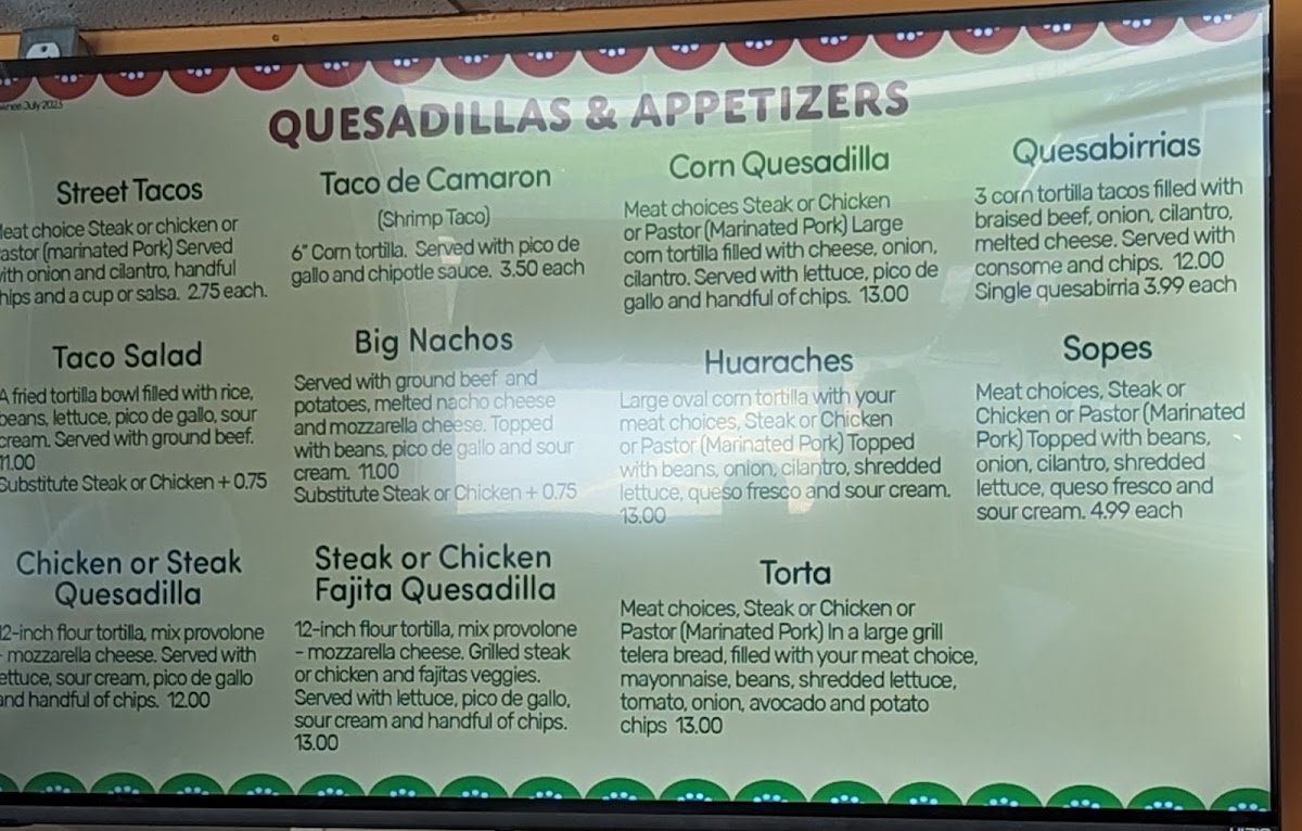 Large oval corn tortilla with your meat choices, steak or chicken or pastor (marinated pork) topped with beans, onion, cilantro, shredded lettuce, queso fresco and sour cream.