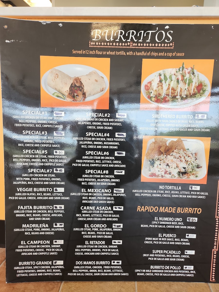 Grilled chicken, or steak, grilled bell peppers, rice, grilled onions, fried potatoes, cheese and chipotle sauce.